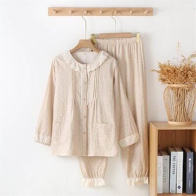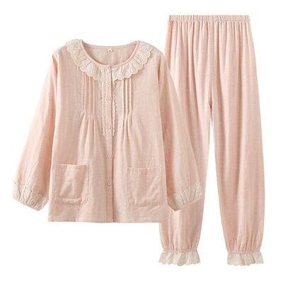 ガーゼ パジャマ レディース ルームウェア パンツ 春 秋 ガーゼコットン レース フリル 春秋 長袖 ギャザー ダブルガーゼ 2重ガーゼ 綿 部屋着 セットアップ 2点セット ナイト 寝間着 寝巻き