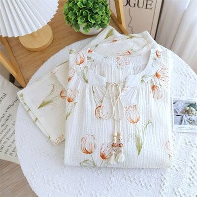 ガーゼ パジャマ レディース ルームウェア パンツ 春 秋 ガーゼコットン キーネック 花柄 春秋 長袖 ダブルガーゼ 2重ガーゼ 綿 部屋着 セットアップ 2点セット ナイト 寝間着 寝巻き 上下セ