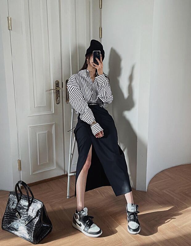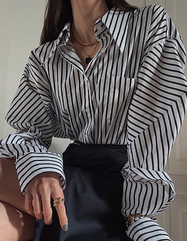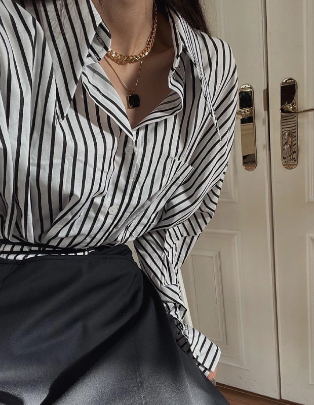 長袖シャツ 切り替え バイカラー 体型カバー 着痩せ ストライプ柄 シンプル