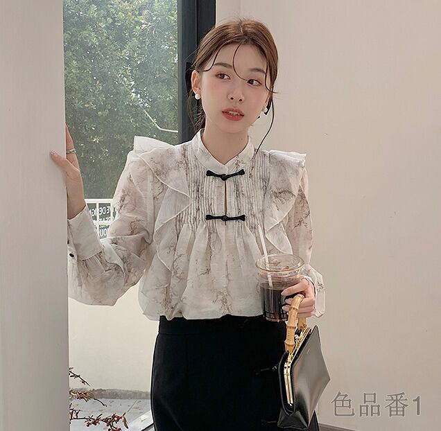長袖シャツ フリル 切り替え 体型カバー 着痩せ sweet系