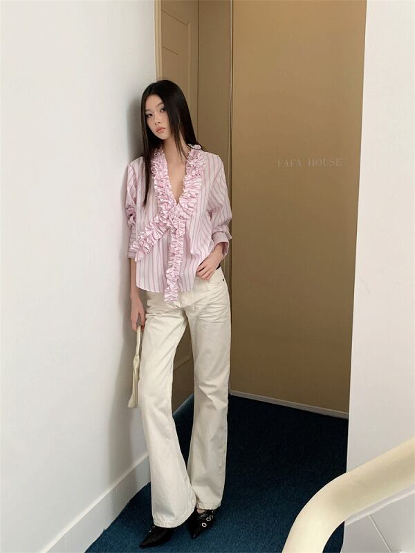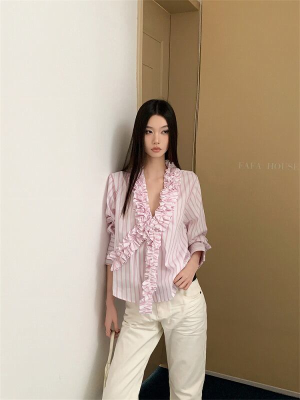 長袖シャツ フリル 切り替え バイカラー 体型カバー 着痩せ ストライプ柄 シンプル