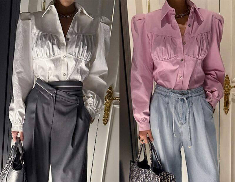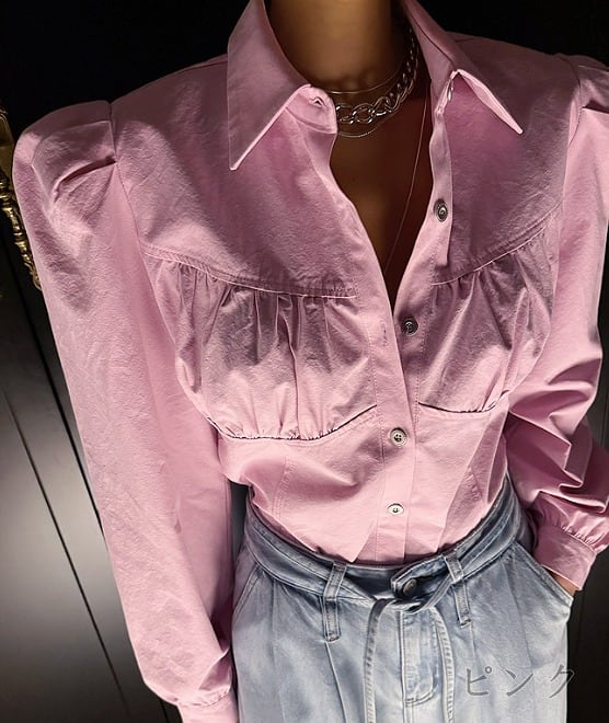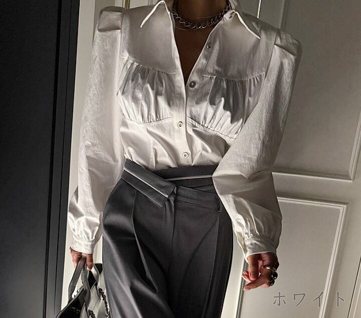 全2色 長袖シャツ ボリューム袖 シャーリング 切り替え 体型カバー 着痩せ シンプル