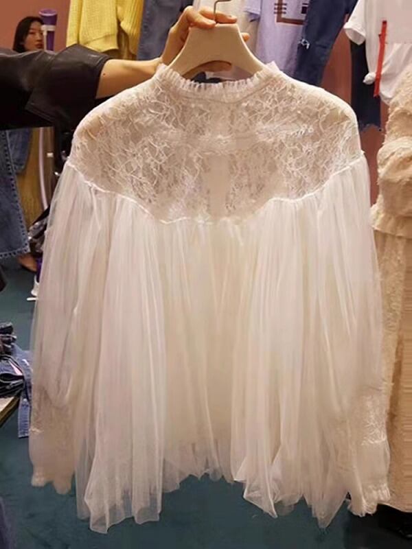 長袖シャツ チュール フリル 切り替え 体型カバー 着痩せ sweet系
