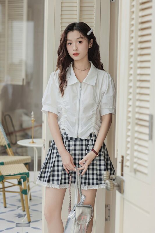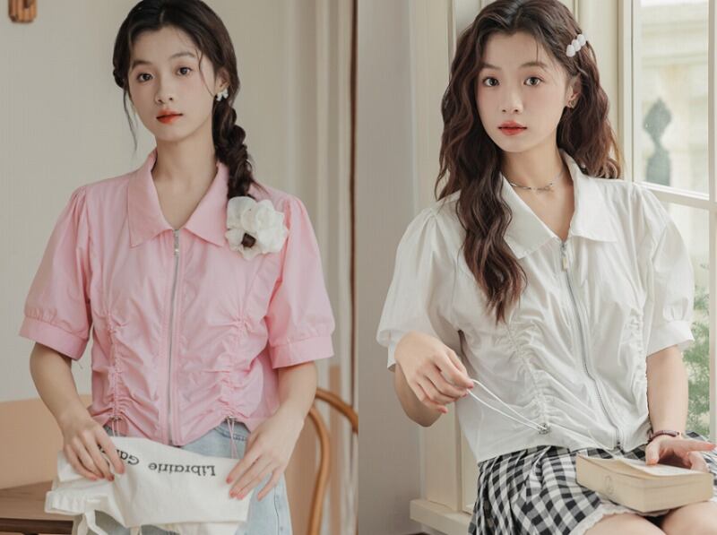 全2色 半袖シャツ シャーリング 切り替え スリム 着痩せ sweet系