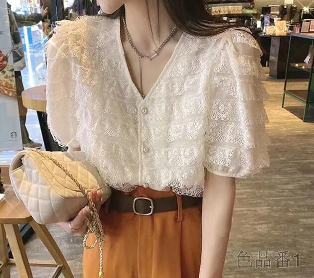 半袖シャツ フリル 切り替え 体型カバー 着痩せ レース 【大きいサイズあり】 sweet系