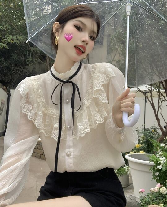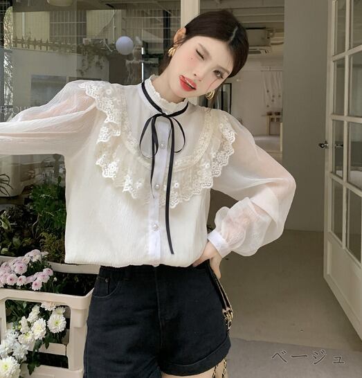 長袖シャツ フリル 切り替え 体型カバー 着痩せ レース sweet系