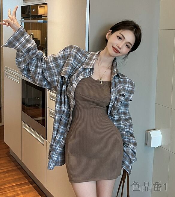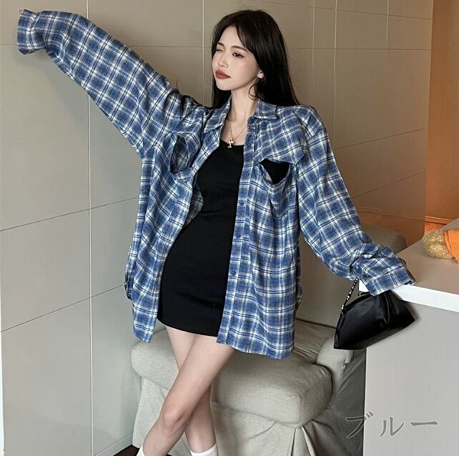 全2色 長袖シャツ 切り替え バイカラー 体型カバー 着痩せ チェック柄 シンプル
