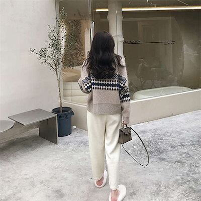 ニットカーディガン レディース 長袖 秋 冬 カーディガン 幾何柄 セーター ゆったり 厚手 丸首 ニットトップス ショット丈 もこもこ アーガイル ドロップショルダー 前開き フロントボタン ノルデ