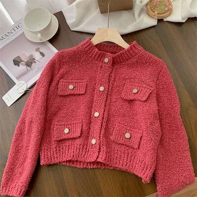 カーディガン ニット ショート丈 トップス レディース ショート丈 春 秋 冬 ふわふわ 長袖 ノーカラー もこもこ ツイード風 セーター ニット 羽織り 柔らかい アウター カジュアル ニットカーデ