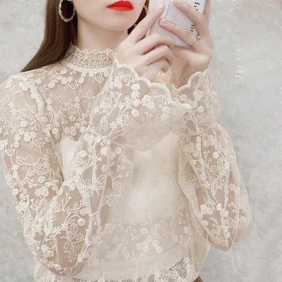 レースブラウス長袖レディースプチハイネックシアートップスシースルーオシャレセクシープルオーバー韓国風きれいめ