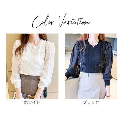 ドッキングプルオーバーブラウスニットレースシアー長袖レディーストップスシースルーバルーン袖可愛いおしゃれ大人可愛い秋無地韓国ファッション