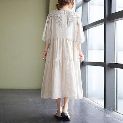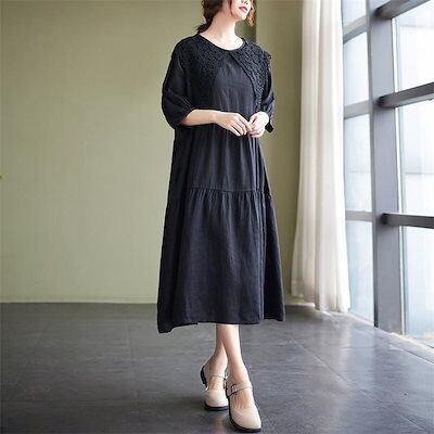 シャツワンピース レディース 春夏 トップス レース 折り襟 オンオフ問わず 5分袖 無地 自然に体型カバー 大きいサイズ 着痩せ 新作