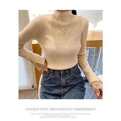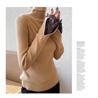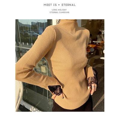 ニット レディース 40代 秋冬 新作 トップス タートルネック 長袖 カットソー レース セーター トップス 韓国風 フレア袖 おしゃれ 30代 50代 白 黒
