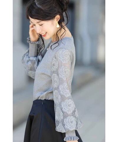 カットソー ニット レディース 初秋 レース 切り替え トップス パフ袖 カットソー ベーシック レース袖 透け感袖 長袖 リブ 柔らかい 着痩せ 女性らしい 大人 春 秋 長袖 通勤 普段着 カジュ