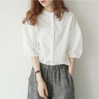 ブラウス 刺繍 レース 長袖 シャツ レディース シャツブラウス 白シャツ スタンドカラー 五分袖 立ち襟 バンドカラー ボリューム袖 シャツ 前開き ボタン トップス 春 夏 可愛い おしゃれ カジ