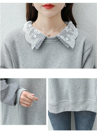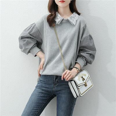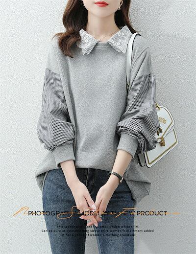 カットソー tシャツ レディース パーカー プルオーバーパーカー バルーン袖 ボリェーム袖 トップス 切り替え 長袖 長袖Tシャツ 折襟 レース 無地 チェック柄 ショート丈パーカー お洒落 大人 可