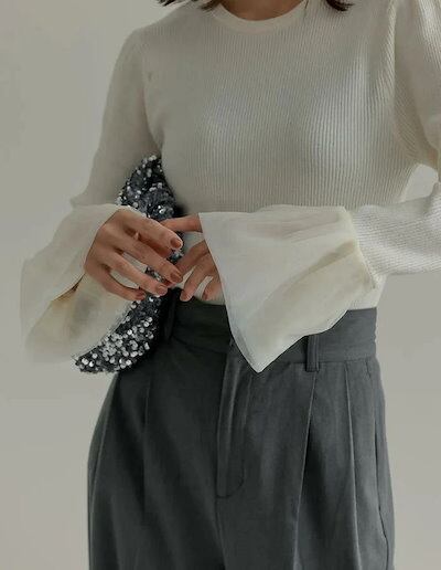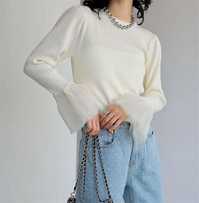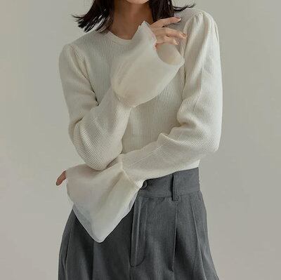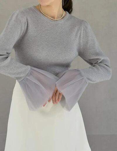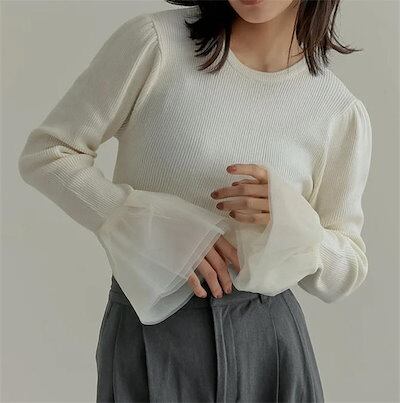 カットソー ニット レディース トップス 秋 冬 春 長袖 フレアスリーブ フレア袖 リブニット ニットトップス チュール レース きれいめ 袖フリル チュールカフス ニットソー チュールスリーブ 袖