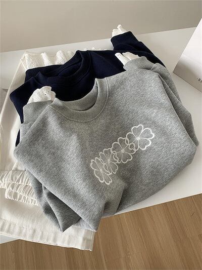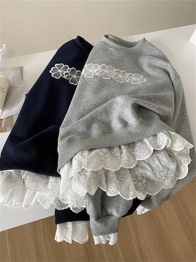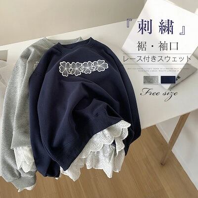 トレーナー レディース フェイクレイヤード 長袖 スウェット 裾袖口 レース 花柄 刺繍 定番 春 秋 春秋 体型カバー プルオーバー トップス リラックス シンプル 重ね着 レイヤード 着痩せ クー