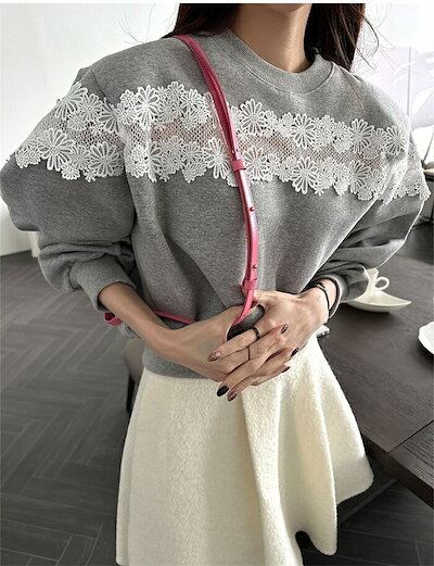 トレーナー レディース 長袖 秋冬 スウェット ショート丈 レース 切替 キレイめ ラウンドネック 裏起毛 プルオーバー トップス 透かし編み 異素材切り替え ゆったり 体型カバー 無地 シンプル カ