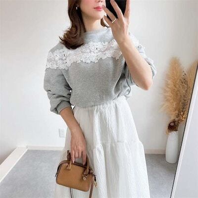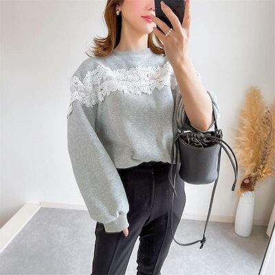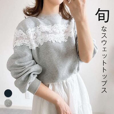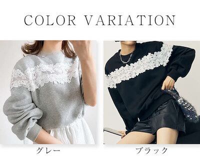 トレーナー レディース トップス プルオーバー スウェット 長袖 レースプルオーバー 切り替え 異素材 カットソー ゆったりドロップショルダー フリル袖 花 レース クルーネック 秋 冬 春 女性 上