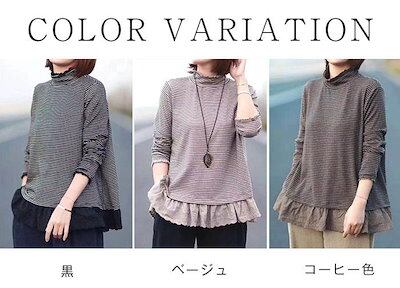 カットソー 長袖 レディース ハイネック tシャツ レディース 長袖カットソー インナー ストライプ 長袖tシャツ プルオーバー トップス ネックフリル 袖フリル 切り替え レース 重ね着 定番 着回