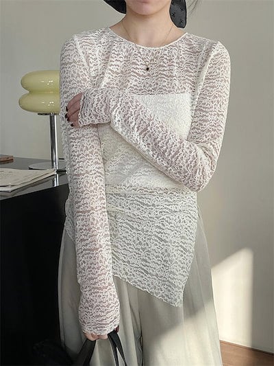 レース tシャツ レディース カットソー トップス ブラウス 長袖 レースシャツ 総レース レースtシャツ サイドスリット スーツ インナー クルーネック 春 夏 透け感 セクシー おしゃれ 着回し
