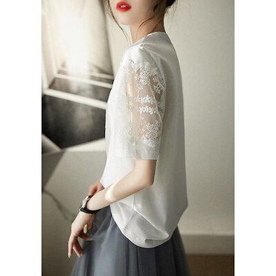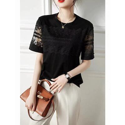 Tシャツレディース夏トップスエレガントなレースが縫い合わせられた透かしのトップス薄手若見え気質半袖Tシャツマルチ