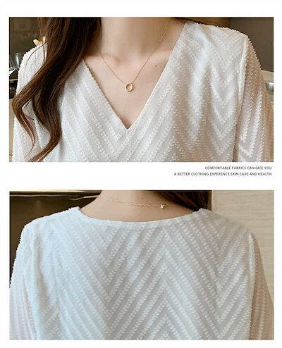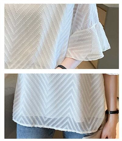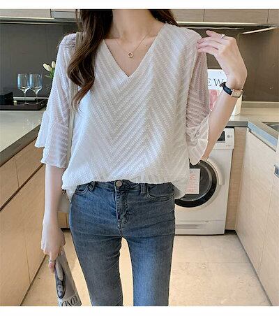ブラウス シャツブラウス 半袖 レディース 無地 五分袖 フリル 夏 薄手 白 カットソー フレア袖 トップス Vネック シフォン 透け感 きれいめ ゆったり きれいめ 体型カバー 大人 可愛い こな