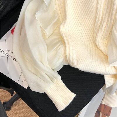 シフォン セーター レディース 長袖 秋冬 異素材 春 フリル リブニット 無地 リブ ニットセーター おしゃれ プルオーバー オフィス トップス ゆったり リラックス 大きいサイズ カジュアル 柔