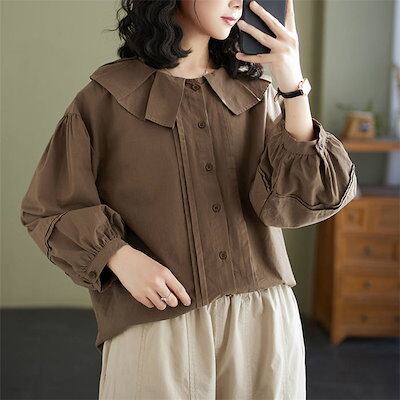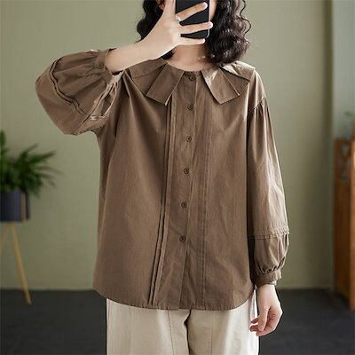 フリル シャツ ブラウス レディース 長袖 コットン 秋 春 無地 タック シャツブラウス トップス カジュアル バンドカラー 大きいサイズ 体型カバー ナチュラル おしゃれ 通勤 秋 冬 春 オフィ