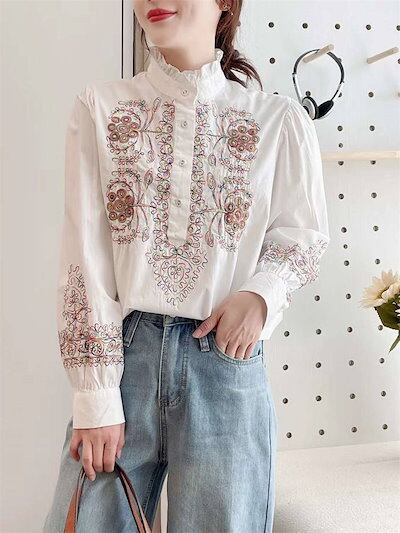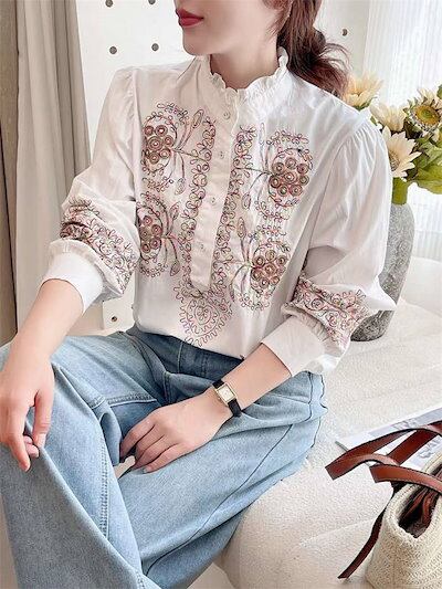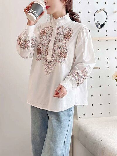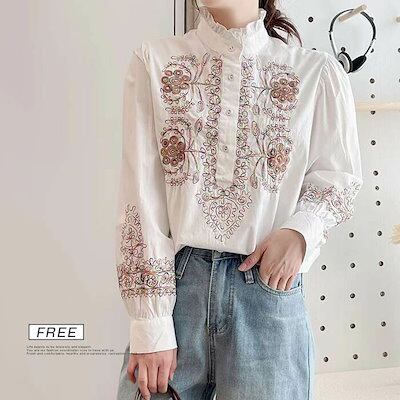 刺繍 シャツ ブラウス レディース 長袖 コットン 秋 春 フリル シャツブラウス トップス カジュアル 大きいサイズ 体型カバー ナチュラル おしゃれ 通勤 秋 冬 春 綿 オフィス シンプル 着回