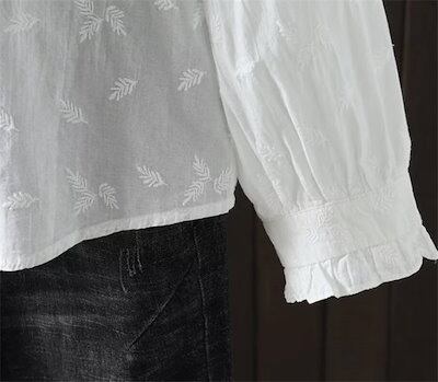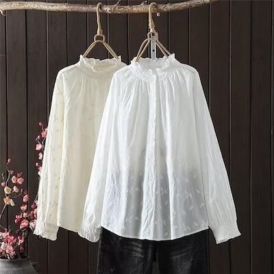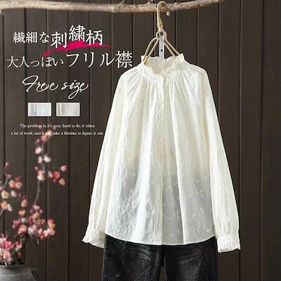 フリル襟 シャツ ブラウス 長袖 立ち襟 刺繍 シャツブラウス レディース トップス 春 秋 フォーマル 大人 可愛い 森ガール ファッション おしゃれ きれいめ ゆったり 体型カバー 重ね着 スーツ