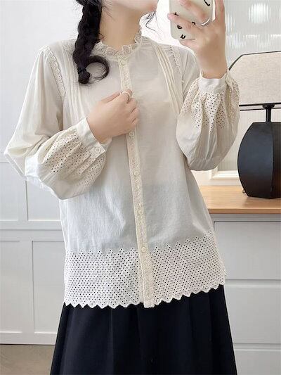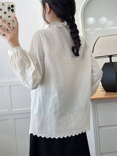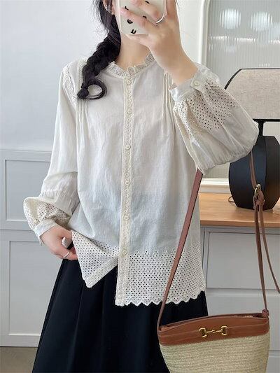 フリル襟 シャツ ブラウス レディース 春秋 刺繍 長袖 可愛い 綿 秋冬 シャツブラウス トップス カジュアル ナチュラル おしゃれ シンプル 通勤 通学 羽織り 春 秋 オフィス お洒落 コット