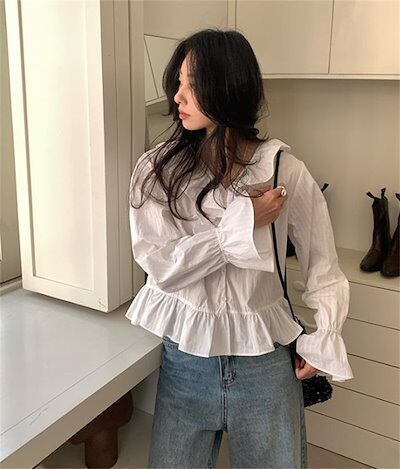 フリル 超可愛い シャツ レディース ブラウス 長袖 綿 フレア ガーリー 上品 ショート丈 トップス シャツブラウス ゆったり ストライプ オフィス vネック パフスリーブ キャンディースリーブ 大