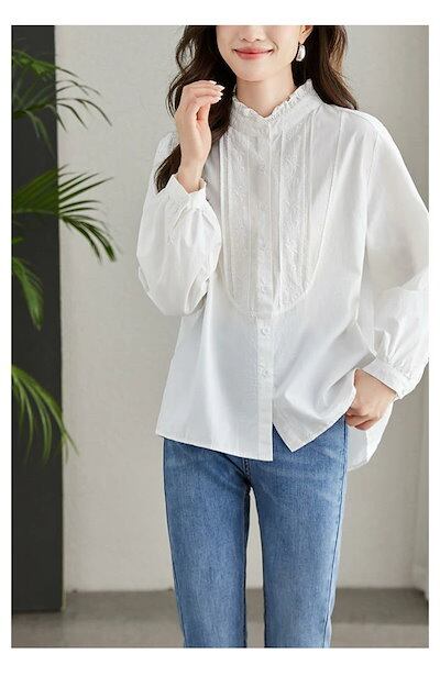 フリル襟 シャツ ブラウス 長袖 立ち襟 花柄 刺繍 ピンタック シャツブラウス レディース トップス 春 秋 フォーマル 大人 可愛い ファッション おしゃれ きれいめ ゆったり 重ね着 体型カバー