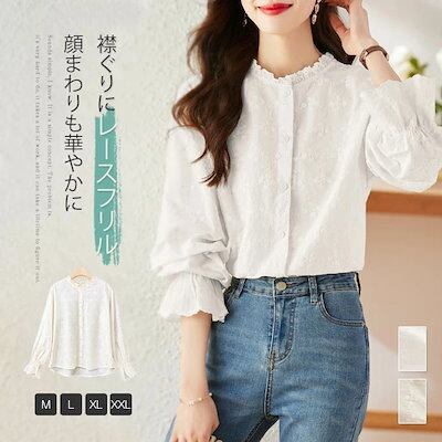 レース フリル襟 シャツ ブラウス 長袖 立ち襟 花柄 刺繍 シャツブラウス レディース トップス 春 秋 フォーマル 大人 可愛い ファッション おしゃれ きれいめ ゆったり 重ね着 体型カバー オ