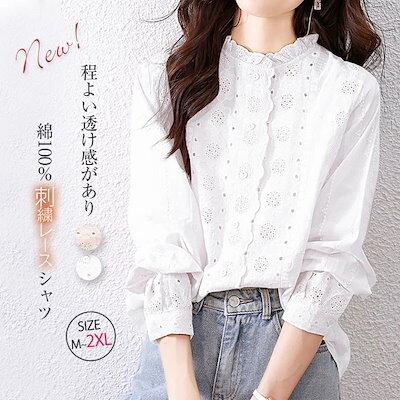 フリル 襟 シャツ ブラウス レディース レース 花柄 刺繍 長袖 春 秋 シャツブラウス トップス 刺繍シャツ 可愛い ゆったり 体型カバー オリジナル 上品 きれいめ 通勤 オフィス 着回し 定