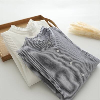 フリル襟 シャツ ブラウス レディース 長袖 立ち襟 ピンタック ギャザー 無地 ストライプ シャツブラウス トップス 春 秋 フォーマル 大人 ファッション おしゃれ きれいめ ゆったり 重ね着 イ