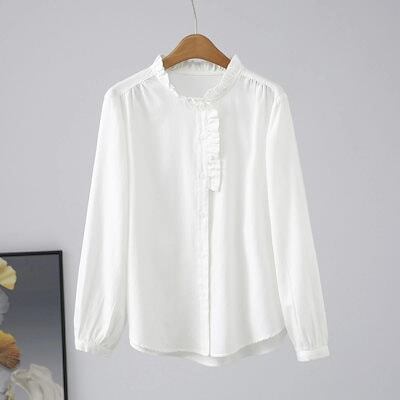 コットン シャツ レディース 長袖 ブラウス フリル襟 シャツブラウス 春 秋 インナー 白シャツ 可愛い トップス フォーマル 無地 ホワイト オフィス 綿 チュニック カットソー 通勤 ワイシャツ