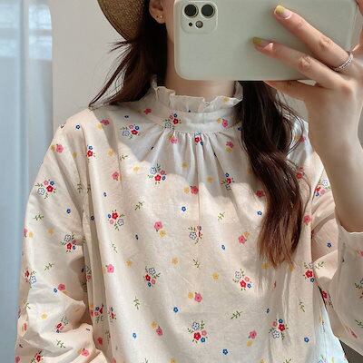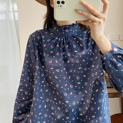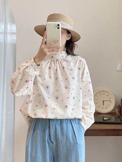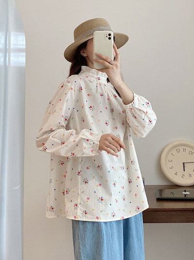 ブラウス 立ち襟 フリル シャツブラウス 長袖 春 シャツ 花柄 レディース トップス 花柄ブラウス 長袖シャツ きれいめ フリルブラウス 綿 コットン 綿シャツ フリル 衿 大人可愛い おしゃれ お