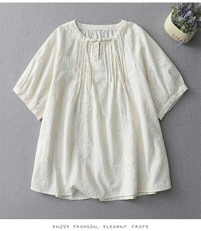 ブラウス シャツブラウス レディース シャツ 夏 半袖シャツ トップス 半袖ブラウス バルーン袖 刺繍 プルオーバー 花柄 ショート丈 白シャツ ホワイトシャツ 無地 綿 フリル グルーネック 体型カ