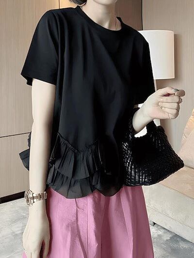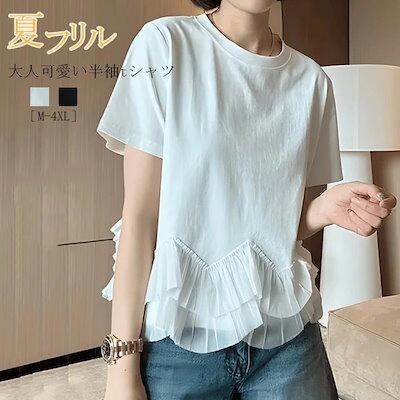 フリル tシャツ 半袖 レディース 切り替え 半袖tシャツ トップス ブラウス カットソー Tシャツ 体型カバー クルーネック ボリューム 丸首 大きいサイズ 大人可愛い フェミニン きれいめ おしゃ