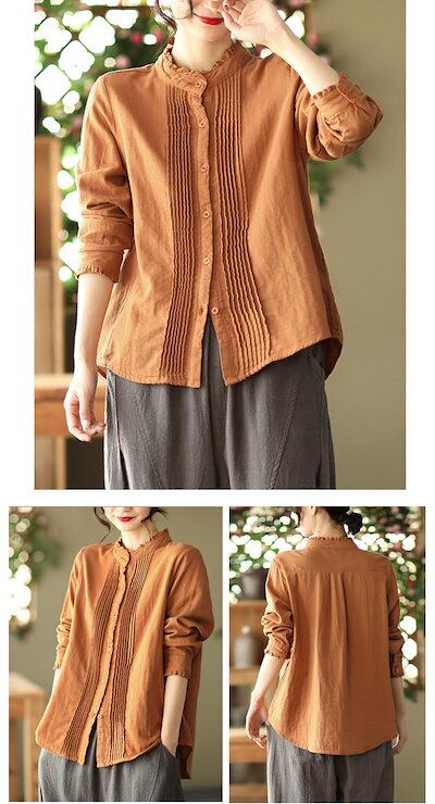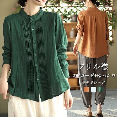 2重ガーゼ シャツ 長袖 レディース 秋 春秋 フリル襟 ブラウス 長袖シャツ シャツブラウス トップス フリル襟シャツ ギャザー 春 ホワイトシャツ 長そで 白シャツ 大きいサイズ アウター 前開け