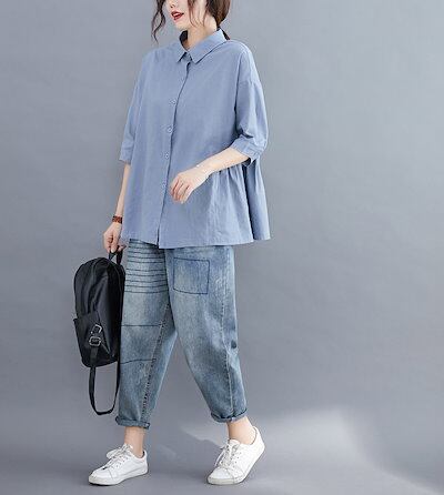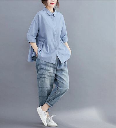 シャツ 半袖 レディース 夏 トップス リネン 綿麻 ブルー フレンチスリーブ レギュラーネック フリル フレア カジュアル ゆったり 着まわし 夏 50代 40代 30代 体型カバー 着痩せ 前開き