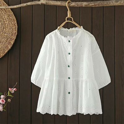 コットンレースブラウス ボリューム袖 チュニックブラウス レディース 夏 五分袖 ブラウス 刺?花柄 レース フリル襟ブラウス トップス 立ち襟シャツ 綿混 森ガール キレイめ カジュアル 大人可愛い