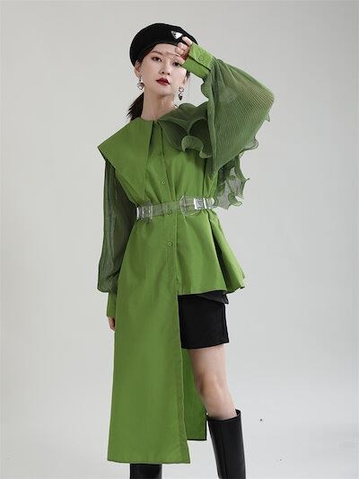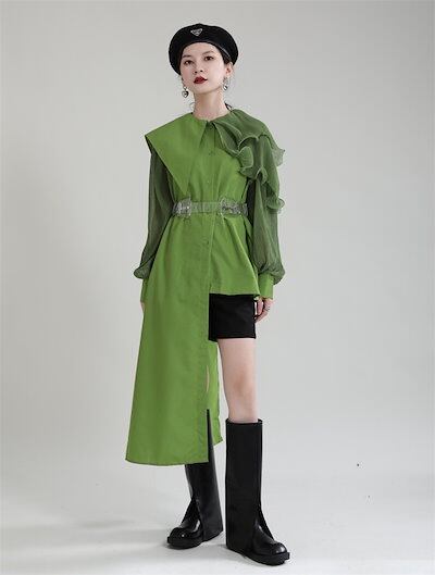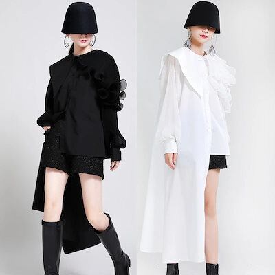 【J.Fashion】 ワンピ風 不規則デザイ ブラウス フリル 肩飾り 透明ベルト付き チュニック レディース おしゃれ 春秋 長袖 ブラウス カシミヤタッチ 日焼け止め メガ割