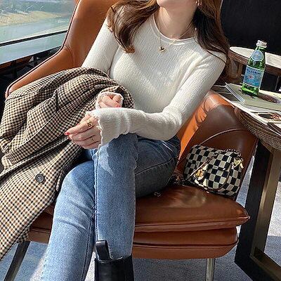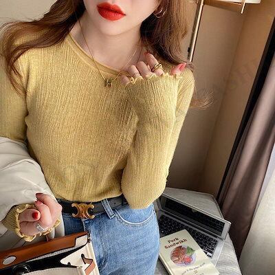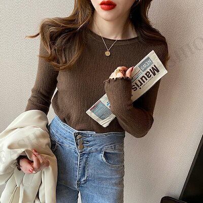 [QINGCE]カットソー プルオーバー トップス レディース 長袖 シンプル 無地 タイト ラウンドネック 重ね着 メロウ フリル 大人 カジュアル フェミニン 上品 きれい