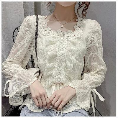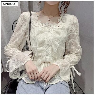 ブラウス レース フリル レースアップ スクエアネック キャンディースリーブ 長袖 レトロ 韓国ファッション レディース 大人可愛い ガーリー フェミニン