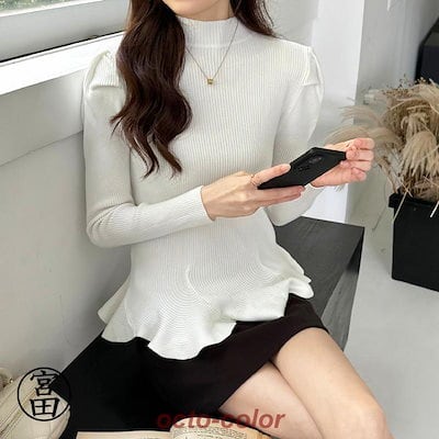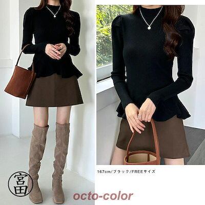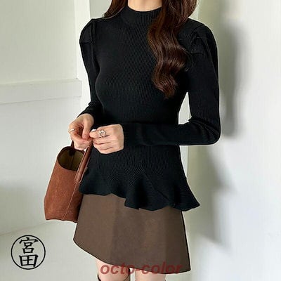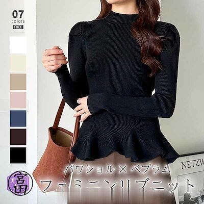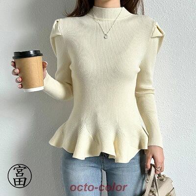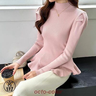 冬の暖かさ!ペプラム ニット チュニック トップス 長袖 レディース リブニット ハイネック フリル パワショル パワショルトップス パワショルニット ニットセーター パフ