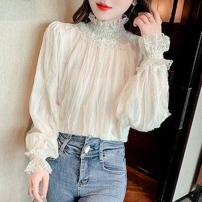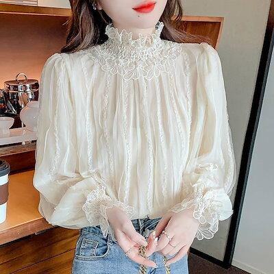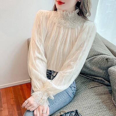 レースブラウス 長袖 シフォンシャツ 花柄 春秋 トップス インナー シャツブラウス レディース プチハイネック フリル トップス